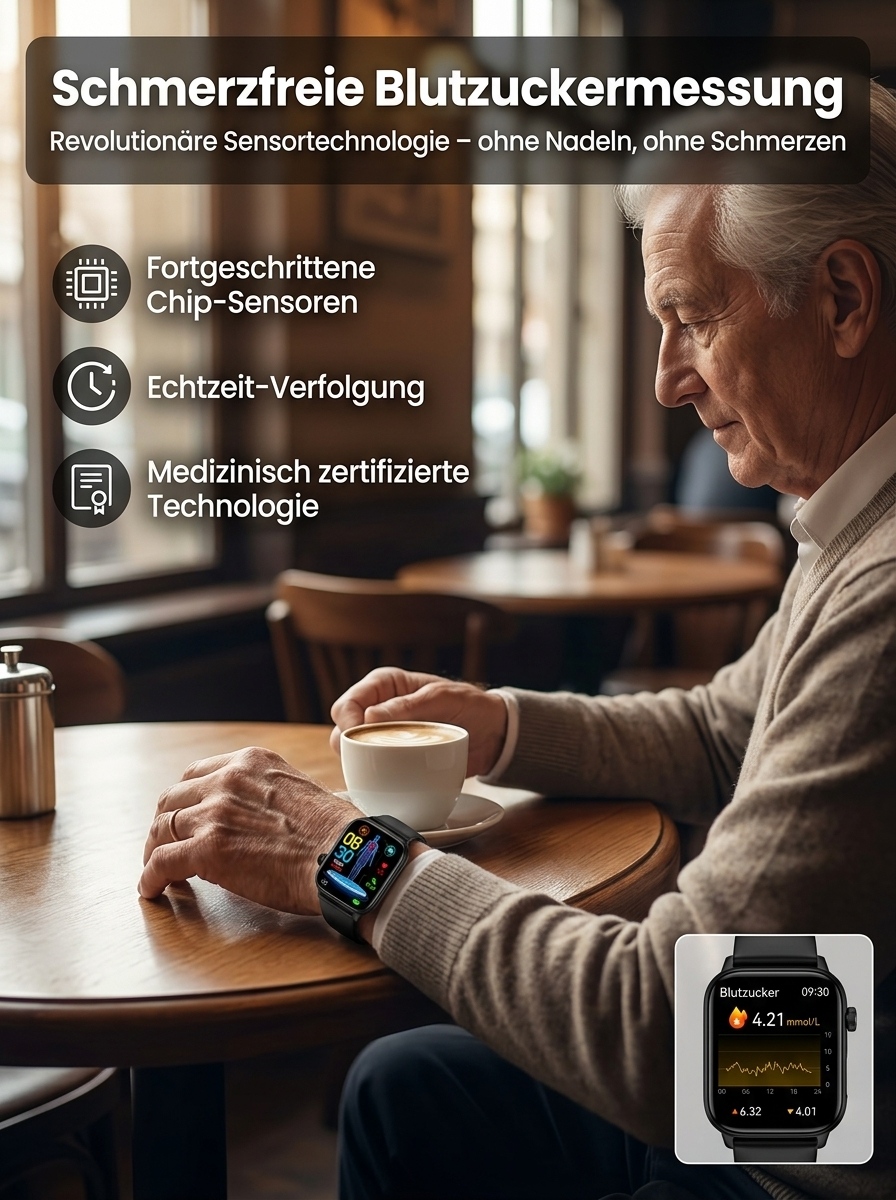 Schluss mit dem Stechen! Blutzucker und Blutdruck direkt am Handgelenk messen – Ihr 24h-Gesundheitsschutz.