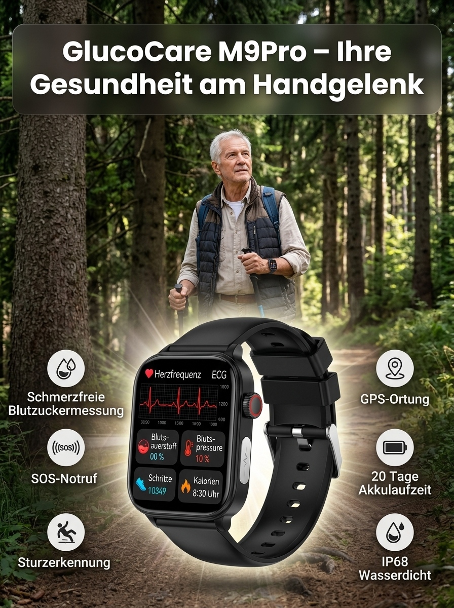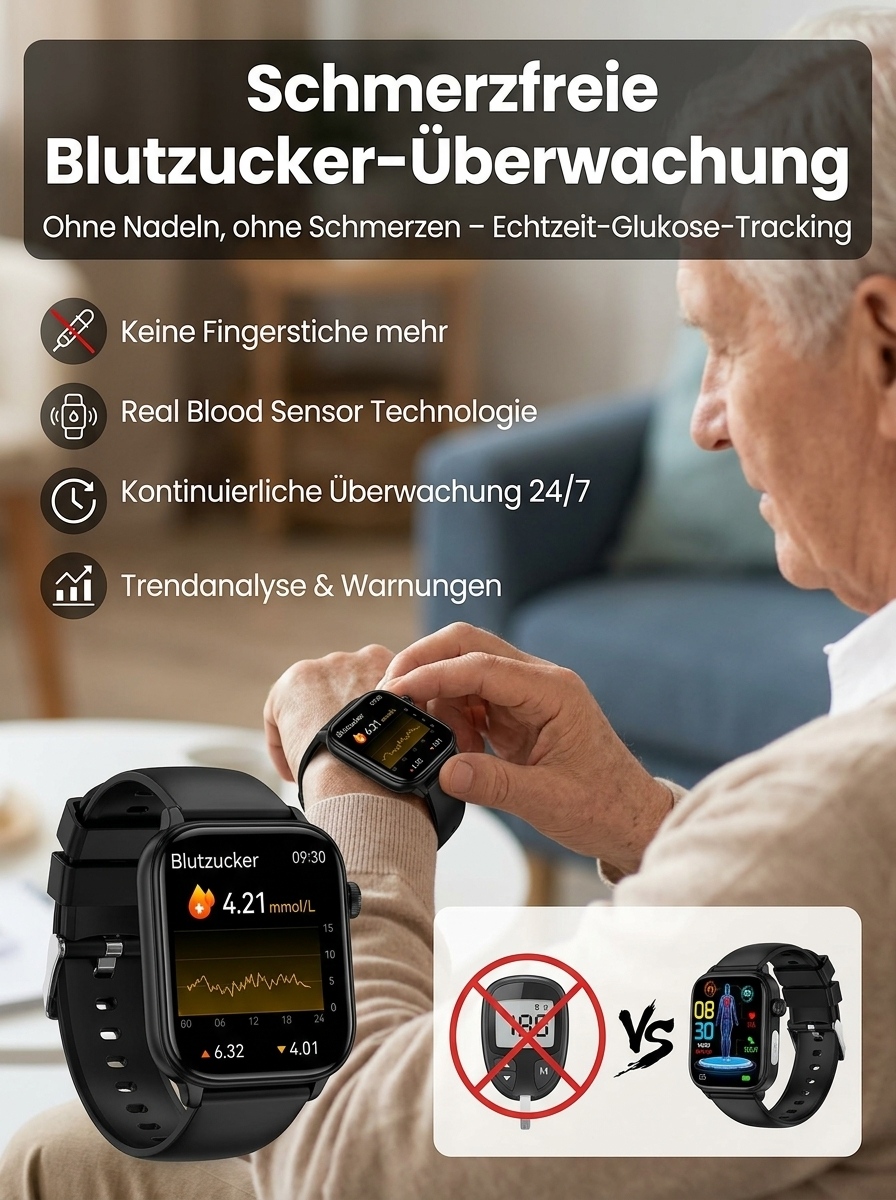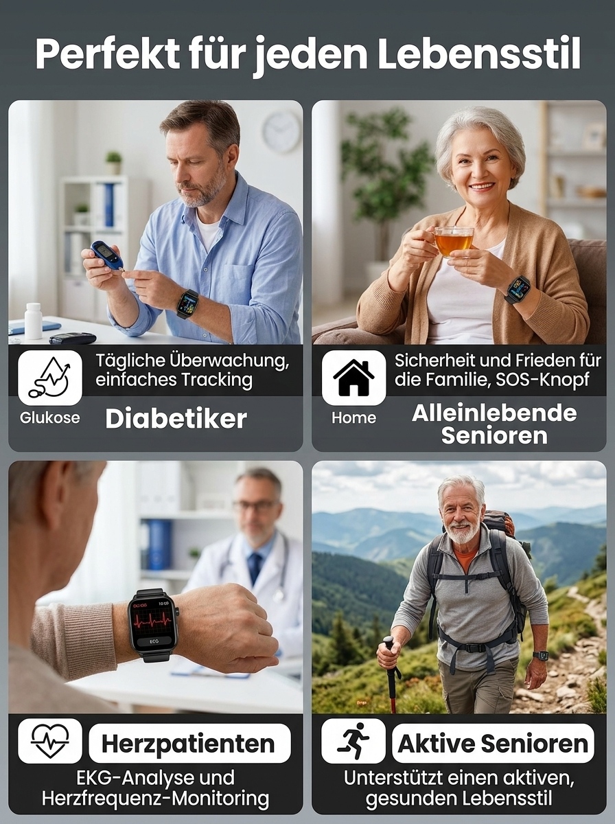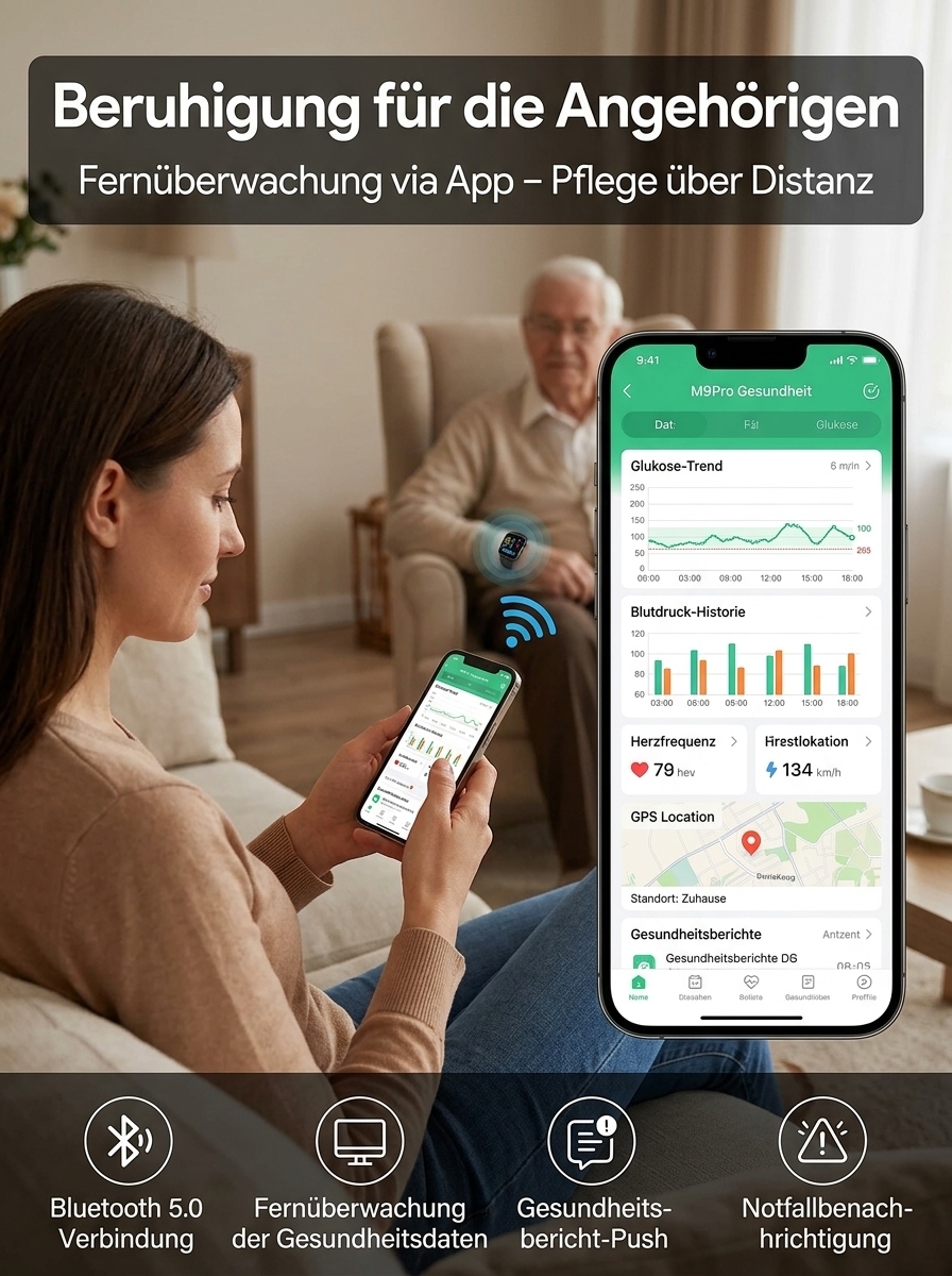 24 Stunden Gesundheitsschutz 🔒Non-invasiver Glukosemessung, Blutzucker, Blutdruck, Herzfrequenz, Sauerstoffsättigung 🩺Über 20 Tage Akkulaufzeit ⚡Automatische Sturzwarnung 🛡️