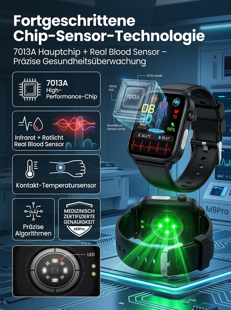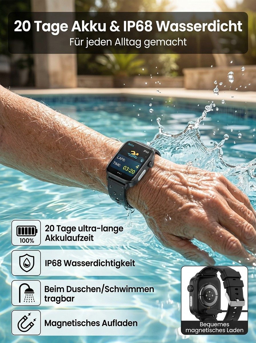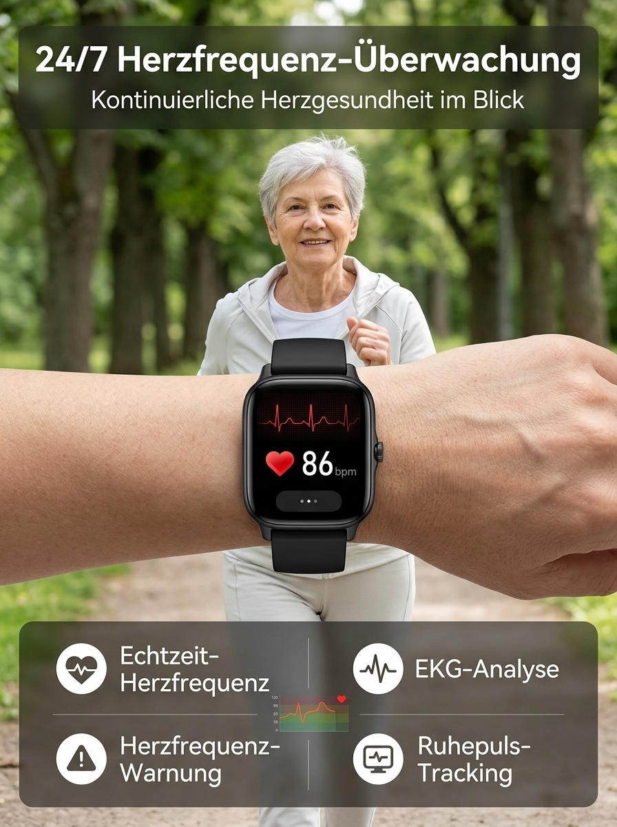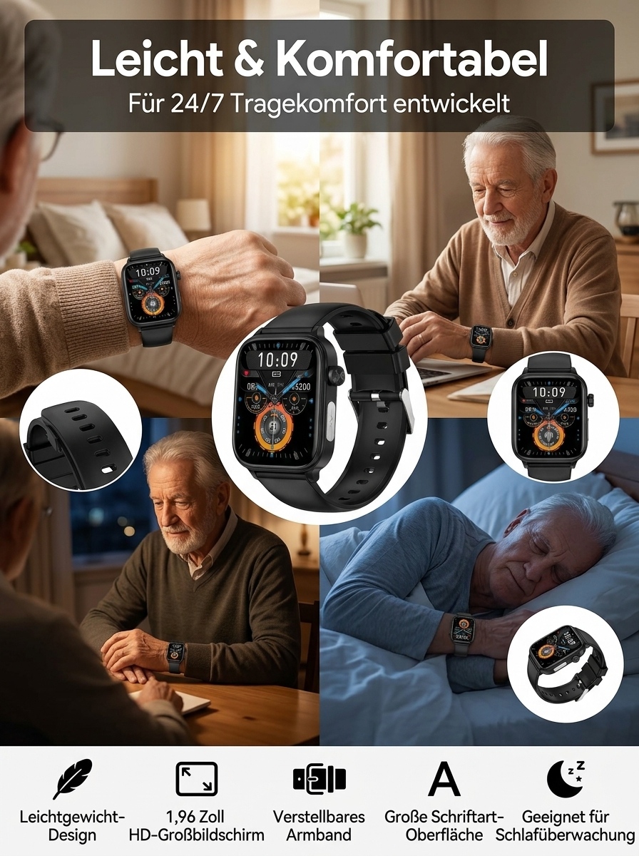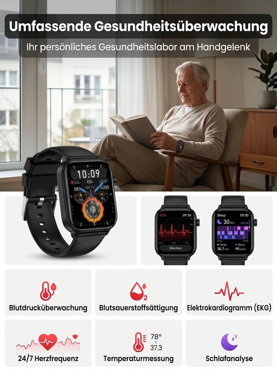 24 Stunden Gesundheitsschutz 🔒Non-invasiver Glukosemessung, Blutzucker, Blutdruck, Herzfrequenz, Sauerstoffsättigung 🩺Über 20 Tage Akkulaufzeit ⚡Automatische Sturzwarnung 🛡️