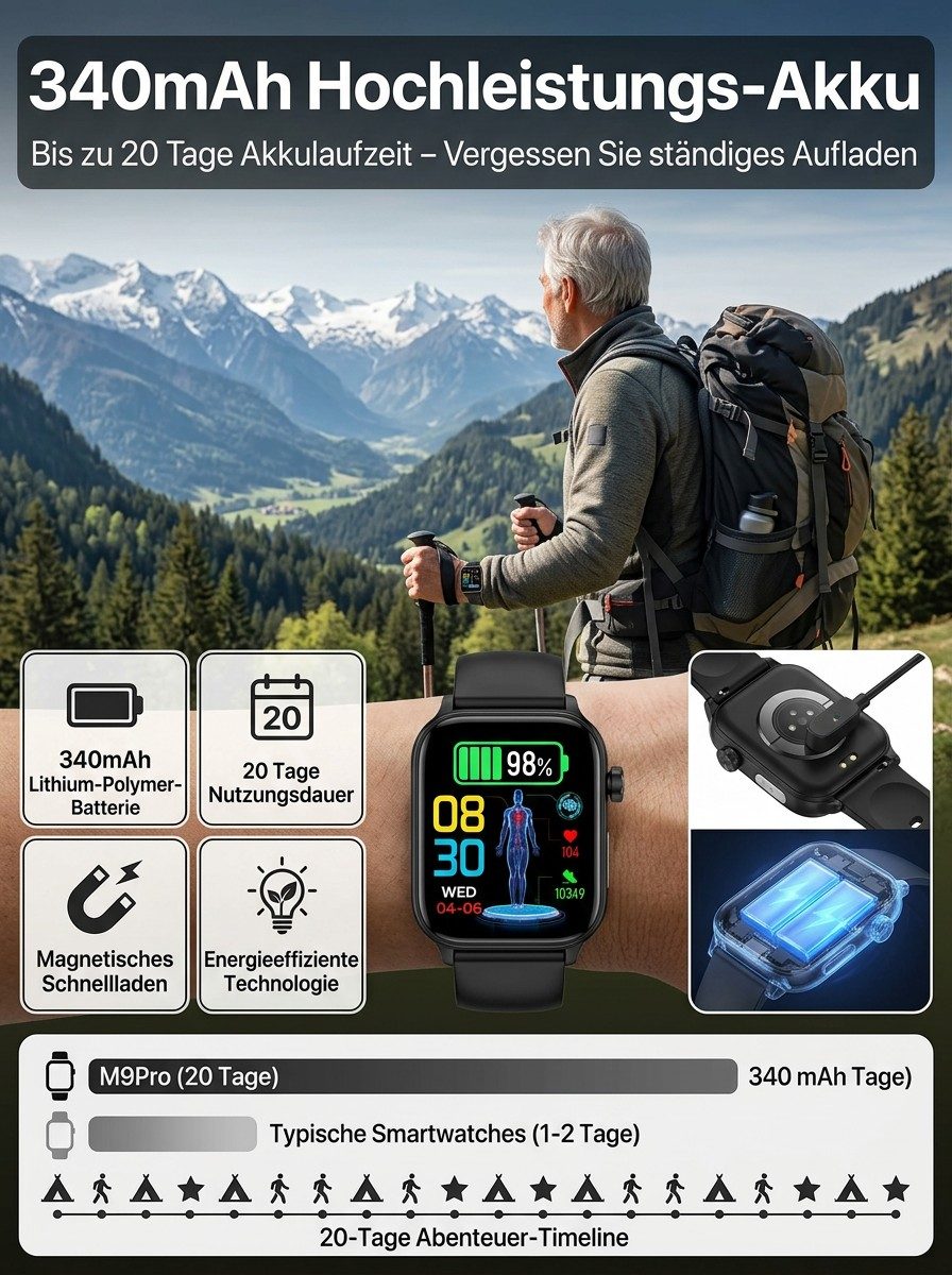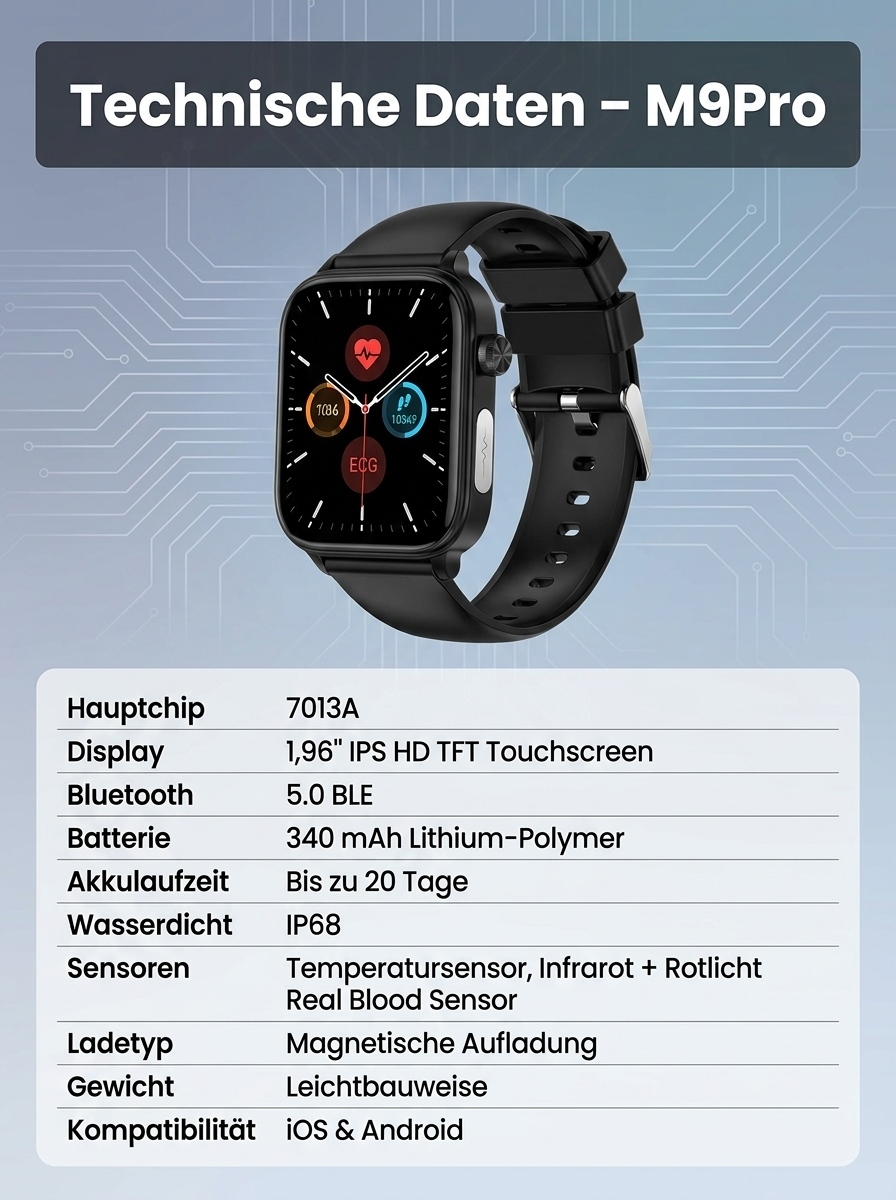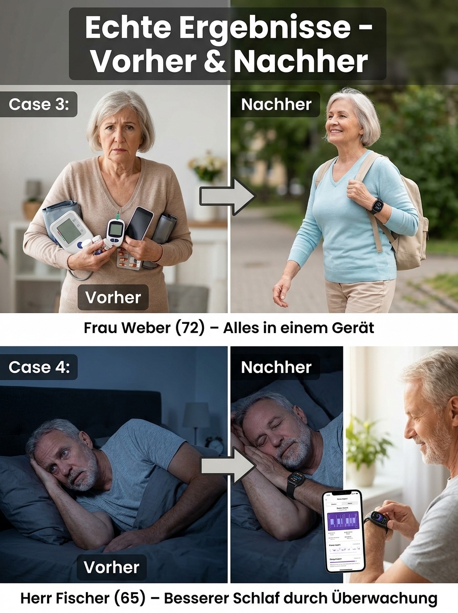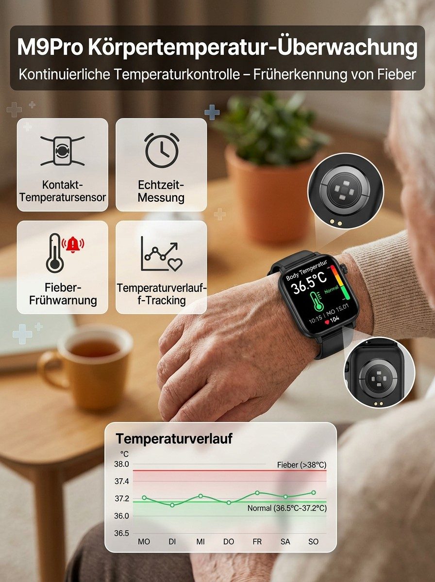 24 Stunden Gesundheitsschutz 🔒Non-invasiver Glukosemessung, Blutzucker, Blutdruck, Herzfrequenz, Sauerstoffsättigung 🩺Über 20 Tage Akkulaufzeit ⚡Automatische Sturzwarnung 🛡️